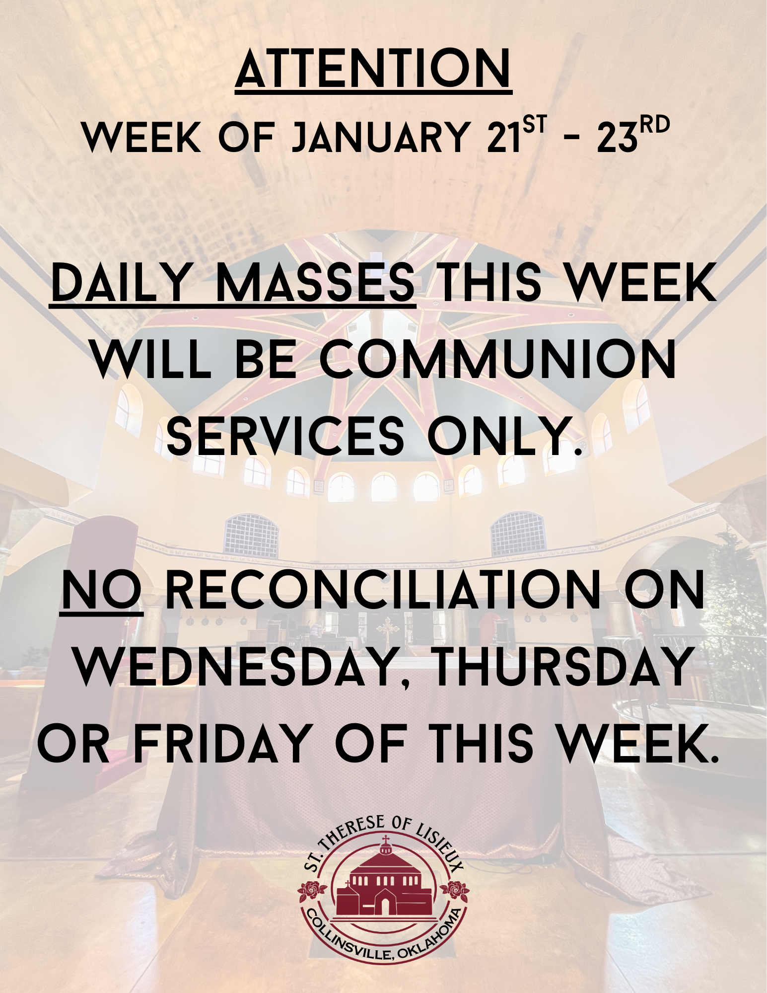 - Daily Masses & Reconciliation – All Masses this week will be communion services only. NO reconciliation this week on Wednesday, Thursday, or Friday.