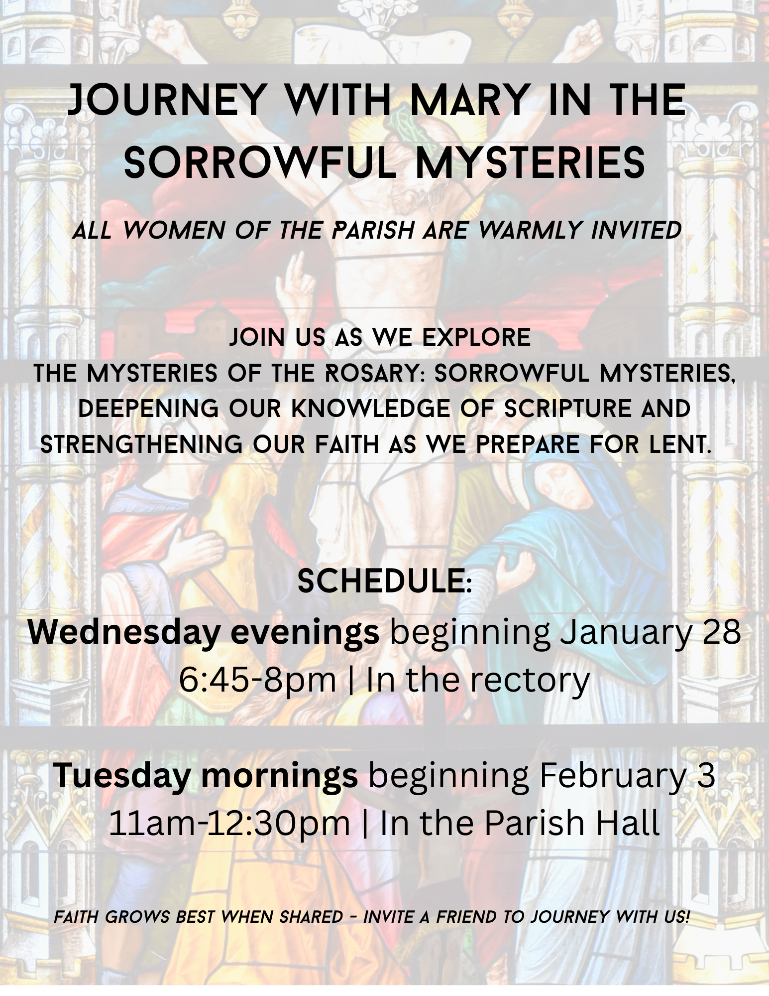 - Save the Date – Journey with Mary – Sorrowful Mysteries. Starting Jan 28th.