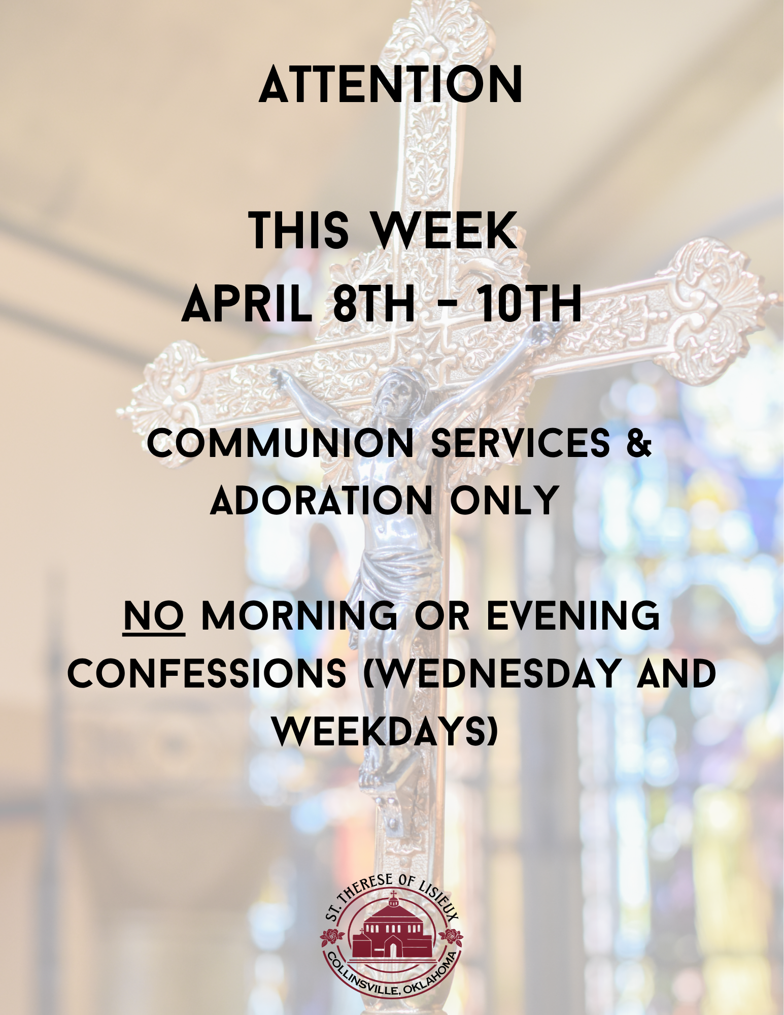 NO Morning Confessions. Communion Services & Adoration ONLY- Apr. 8th-10th